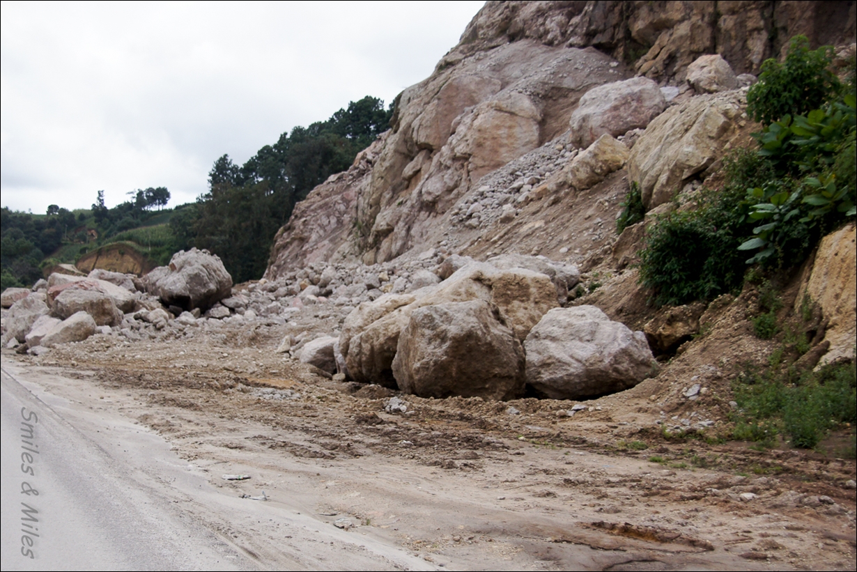 We have arrived here at the end of the rainy season. It shows. Landslides are everywhere. We scramble over at least 40 of them.