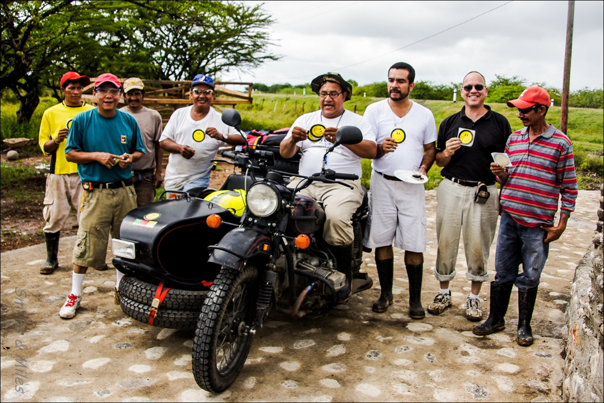When we reach dry land, everyone in sight lends a hand to lift the Ural off of trailer and we are on our three wheels once again, and headed for Leon.