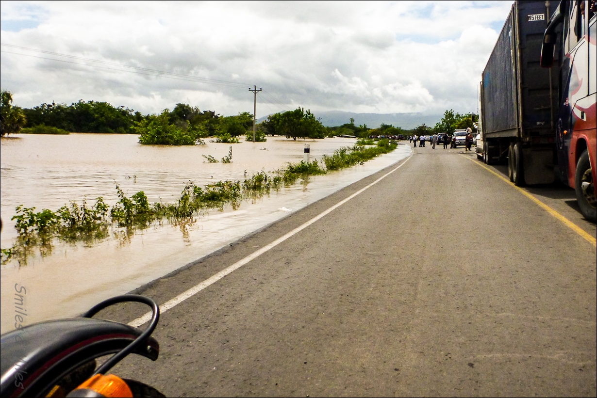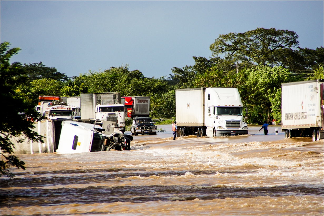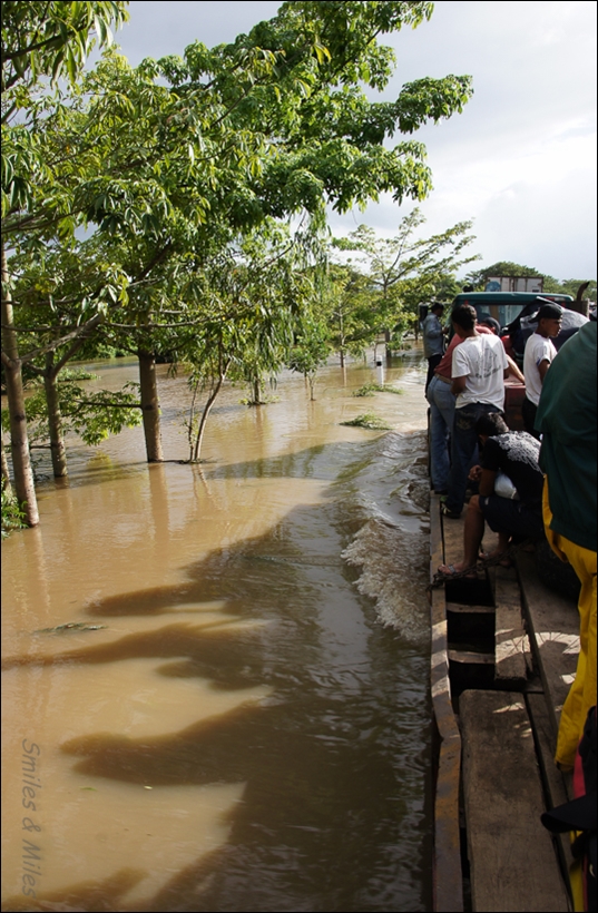 We come to a guard rail sticking out of the water and realize that it is actually the railing of a bridge; the river is high enough to have covered the bank and the bridge. We pass a stranded ‘chicken bus’ and another semi on its side – this would continue for almost eight kilometers before we reach higher ground over an hour later.