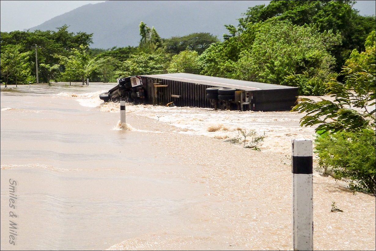 After lunch, our challenge begins in earnest. Water floods across the road and our first sight is of a full-size semi and trailer on its side, pushed off the road by the current, water rushing around and through it. The army is there, as well as curious villagers, stranded trucks, the odd bus, and now us……….