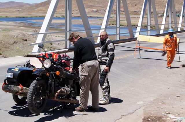 The Bolivian border is almost in sight. As we drive through some road construction, we are suddenly jolted by a deafening sound. To my ears it sounds like a gunshot. I think fast. What do I do in case of random gunfire? Duck? Head for cover? Leave the scene as fast as possible? The entire construction crew freezes on the spot. As our Ural limps to the side of the road, I realize that leaving the scene quickly isn’t an option but also isn’t necessary. There was no gunshot, just the sound of one of our trusty Chinese tires bursting, punctured by construction debris. A quick swap with our spare and we’re on the road again.