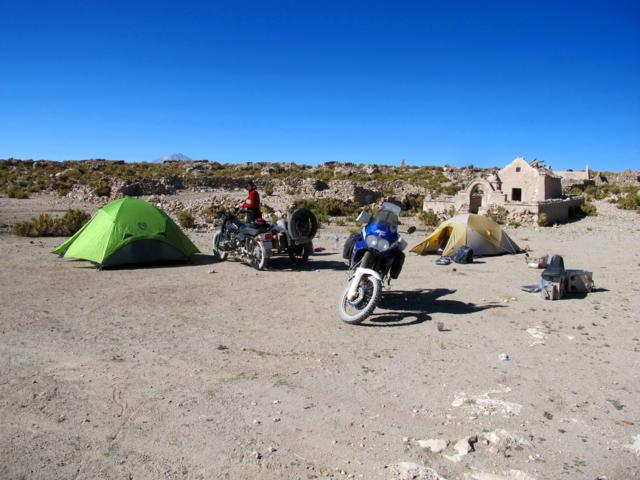 We continued on our route, higher and higher into the hills, until we know that we have barely enough fuel to get back to Llica. Disappointed that the day’s adventure didn’t lead us to where we had hoped, we head back in the direction we came from in search of a suitable camping spot for the night. We had passed an area where there were some collapsed buildings near a school and a couple of homes. At this high altitude, the walls of the collapsed buildings will provide some welcome shelter from the cold night winds and we manage to make it back to this spot and get the tents set up before dark. Grateful for this bit of shelter and even more grateful to have the school’s tiny outhouse nearby, we settle in for a chilly night.