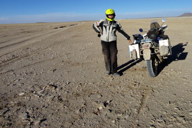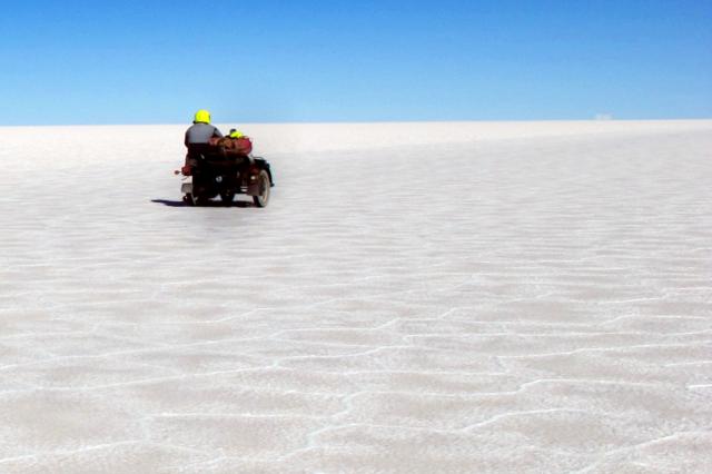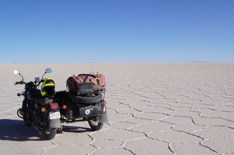 After re-fuelling from old soda bottles from someone’s kitchen, exchanging more money and re-stocking our emergency food supplies, we roll through the town’s military base and to the edge of the salt – the Salar de Uyuni to be more precise. This part of the Altiplano has no outlet to the sea and the minerals leached from the surrounding mountains are deposited here, forming a 12,206 km² salt lake, the largest in the world. There are no tracks across the lake, no landmarks, and only one sign pointing vaguely in the direction of where we are headed, the town of Uyuni, almost 300 km away across this expanse of hexagonal white tiles . With no roads and therefore no map or navigation system to rely on, we point our wheels in the direction indicated by the sign and hope for the best.